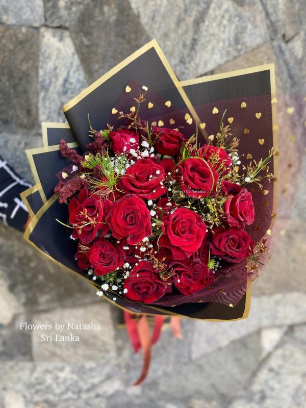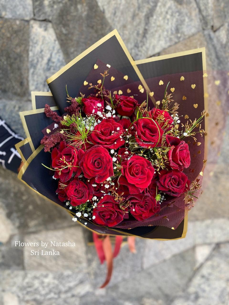 Black Red 20 Premium Velvet Roses Gold hearts Babys Breath Bouquet FREE delivery in Galle Unawatuna Beruwala Kalutara Bentota Induruwa Kosgoda Ahungalla City and beach limits USD 70