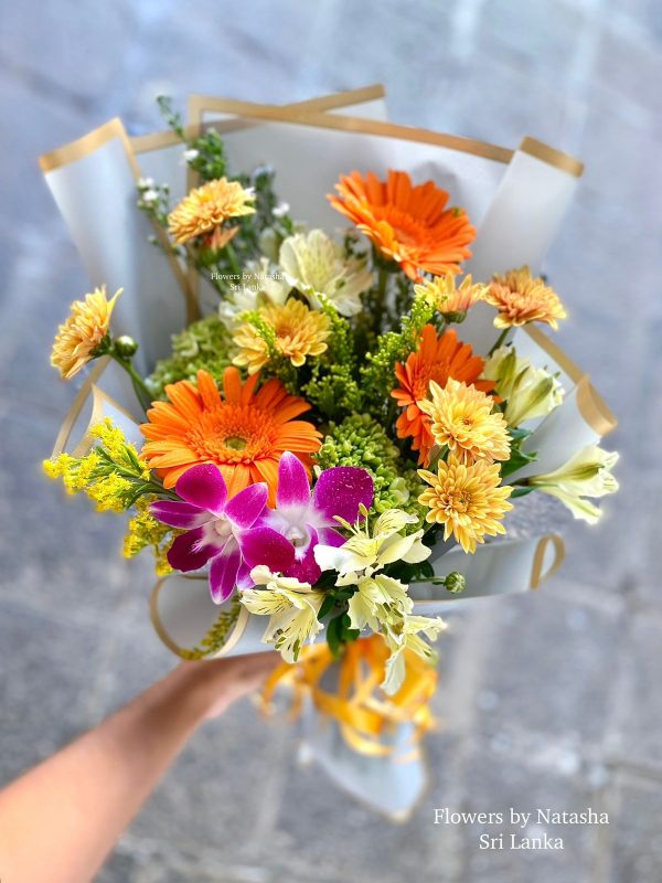Colorful Bouquet of flowers Gold Line White wrapping FREE delivery in Galle Unawatuna Beruwala Kalutara Bentota Induruwa Kosgoda Ahungalla City and beach limits USD 17