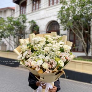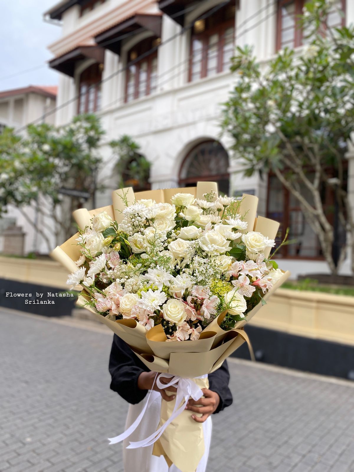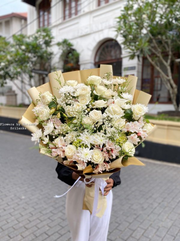 LARGE SIZE BOUQUET 25 White Roses 25 Chrysanthemum Babys breath FREE delivery in Galle Unawatuna Beruwala Kalutara Bentota Induruwa Kosgoda Ahungalla City and beach limits USD 130