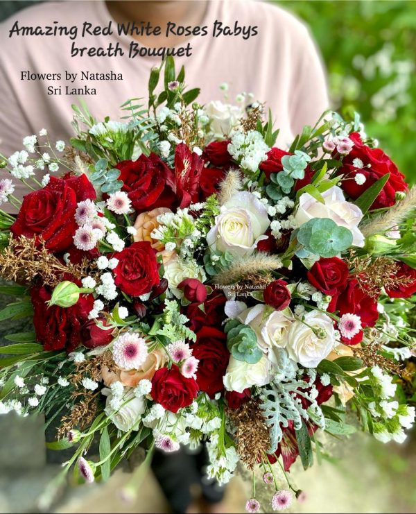 Best Red and White Large and small Roses in different sizes and Rare Mountain Ferns Premium Designer Bouquet
